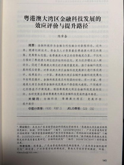 2026年1月,由广东华商金融科技研究院陈章喜教授撰写的决策咨询与战略服务类研究报告《粤港澳大湾区金融科技发展的效应评价与提升路径》,被由广东省社会科学界联合会统筹规划创办、覆盖多学科领域、具备协同创新能力的学术集刊矩阵之一《大湾区研究》第1辑采用,并由广东教育出版社出版发行。