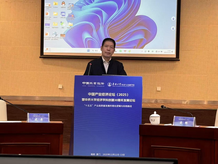 20251212日至13日,中国产业经济论坛(2025)暨“十五五”产业高质量发展的理论逻辑与实践路径研讨会在华侨大学厦门校区举行。此次会议由《中国工业经济》杂志社、中国产业经济研究中心(华侨大学与中国社会科学院工业经济研究所共建)联合主办,华侨大学经济与金融学院承办,华侨大学经济发展与改革研究院、华侨大学数量经济与统计研究院协办。陈章喜教授受邀参加了此次会议并就会议相关主题进行了交流与发言。