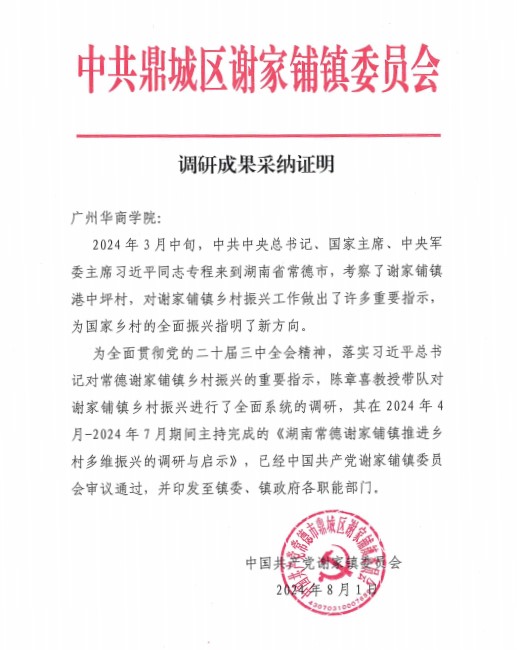 2024年3月中旬,中共中央总书记习近平同志专程来到湖南省常德市谢家铺镇,对谢家铺镇乡村振兴工作做了许多重要指示,为国家乡村振兴的全面推进提出了新的要求。为全面贯彻党的二十届三中全会精神,落实习近平总书记对常德谢家铺镇乡村振兴的重要指示,广东省普通高校特色新型智库“广东华商金融科技研究院”、广东省人文社科重点研究基地“广东乡村振兴金融研究中心”特聘教授陈章喜率团队对湖南常德谢家铺镇乡村振兴工作进行了深度调研,其主持完成的决策咨询报告《湖南常德谢家铺镇推进乡村多维振兴的调研与启示》,已经中国共产党谢家铺镇委员会审议通过并采纳。