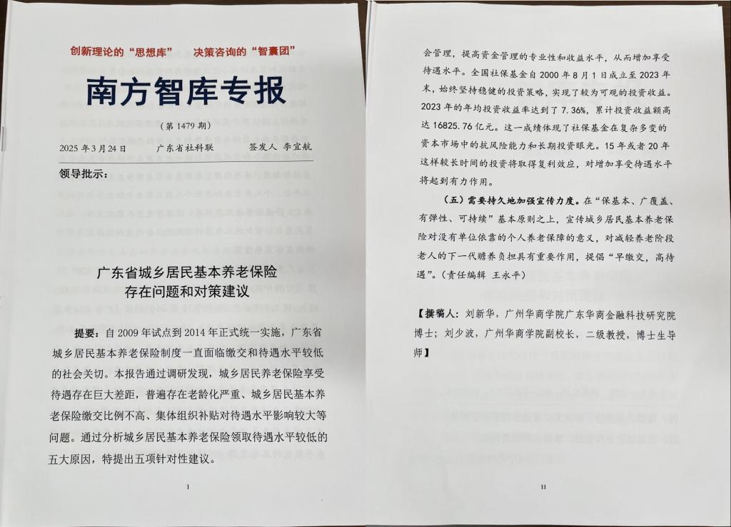 2025324日,由我校广东省普通高校特色新型智库——广东华商金融科技研究院刘新华博士、刘少波教授合作撰写的决策咨询报告《广东省城乡居民基本养老保险存在问题和对策建议》,刊发在《南方智库专报》第1479期。这是《南方智库专报》刊发我院老师撰写的第二篇决策咨询报告。此前一篇亦为我院刘新华和刘少波合作撰写。